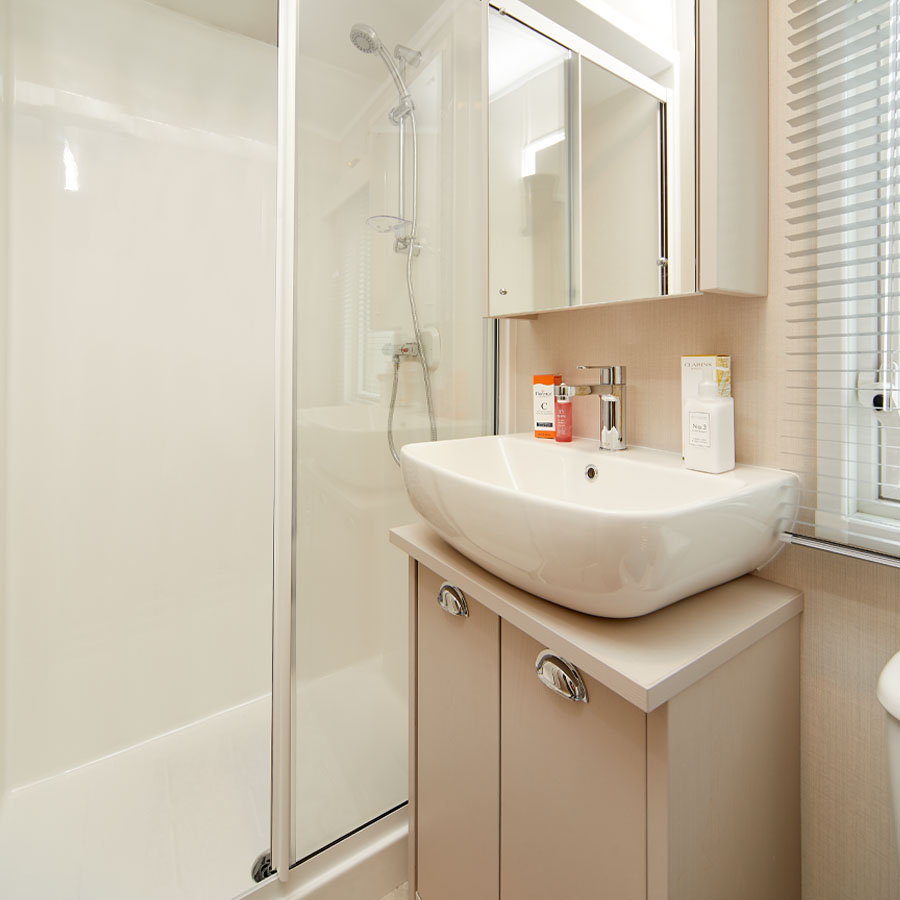 With two bathrooms as standard, convenience comes built into the Lakehouse Lodge. The family bathroom offers a countertop sink, vanity units, mirrored cabinets,