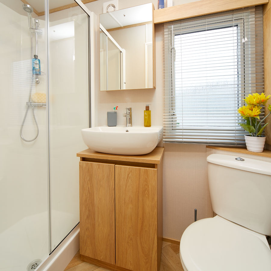 A sleek, floor-standing vanity unit, countertop sink, and matching chrome mixer tap bring a boutique feel to the bathroom. A thermostatically controlled walk-in shower provides the perfect start to the day, with cushioned flooring and ample storage to keep everything organised.