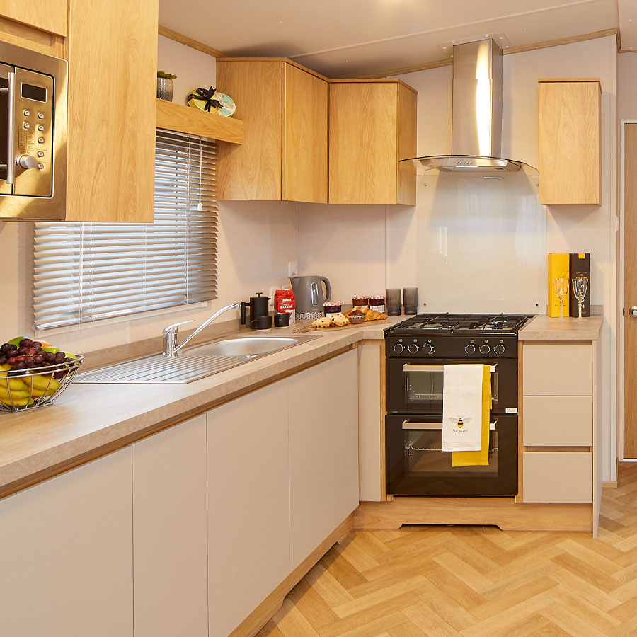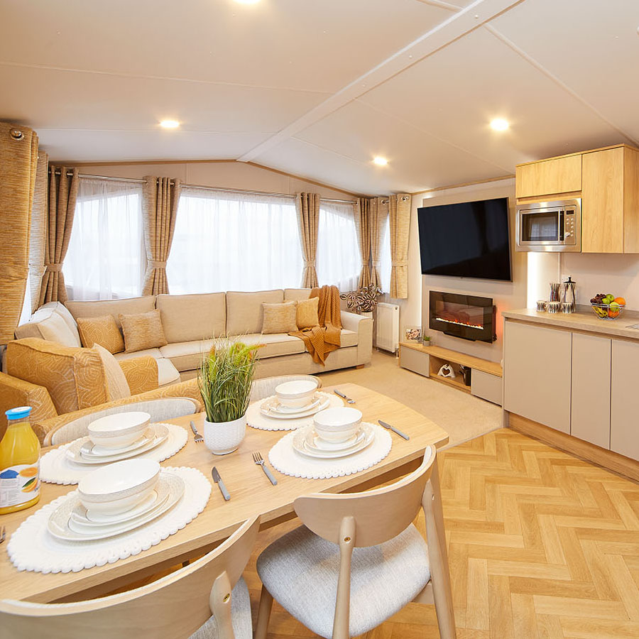 With soft neutral tones, golden oak accents, and warm greys, the Melrose is all about effortless style with a splash of fun. Pops of colour in the soft furnishings add a playful touch, while a cosy corner sofa and standalone armchair invite you to kick back and relax. The bespoke media wall, designed to hold a 65" TV, sets the scene for family movie nights.