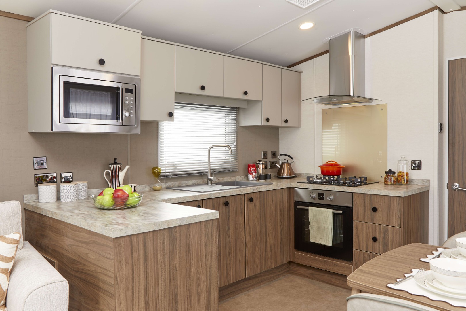 The Carrington's kitchen is at the heart of the holiday home, with warm walnut and pebble grey tones and colour-contrasting cabinet doors. It features a fan-assisted electric oven and grill, four-burner gas hob, integrated fridge freezer, and graphite resin sink with matching tap - everything you need for effortless cooking and entertaining.