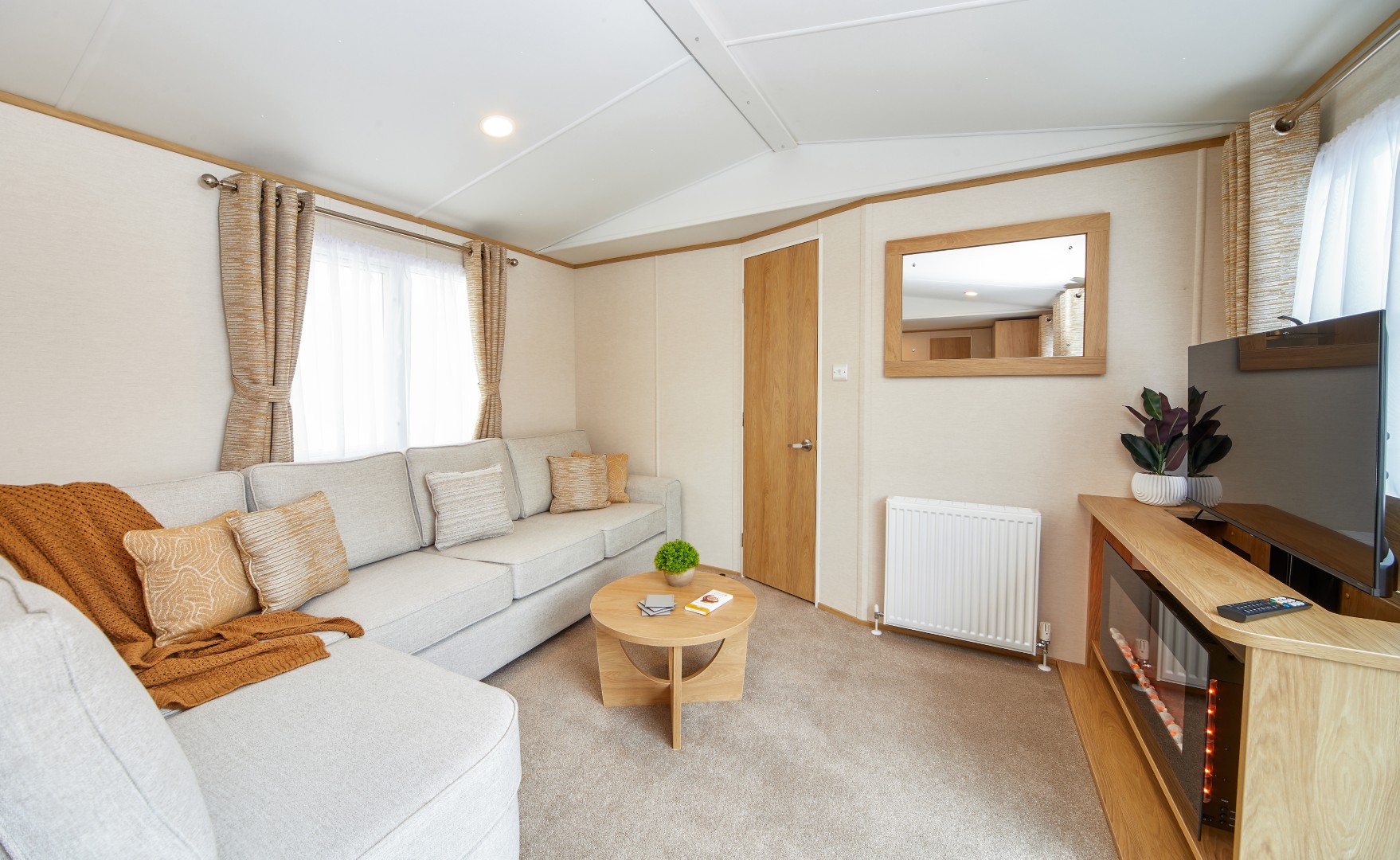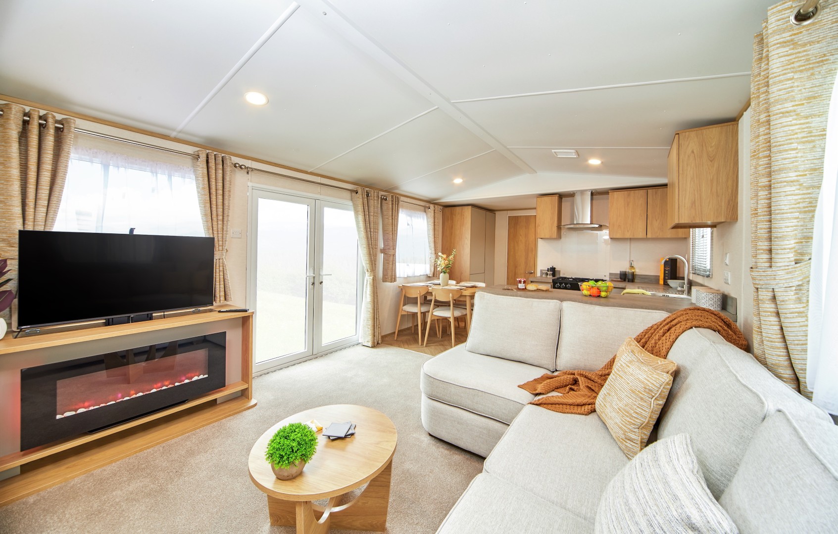 Soft neutral tones and golden oak accents remain at the core of the Melrose design, while the central living space brings an exciting new dynamic. A cosy wraparound sofa and flame effect fire make the lounge the natural hub of the home - perfect for fun-filled family evenings.